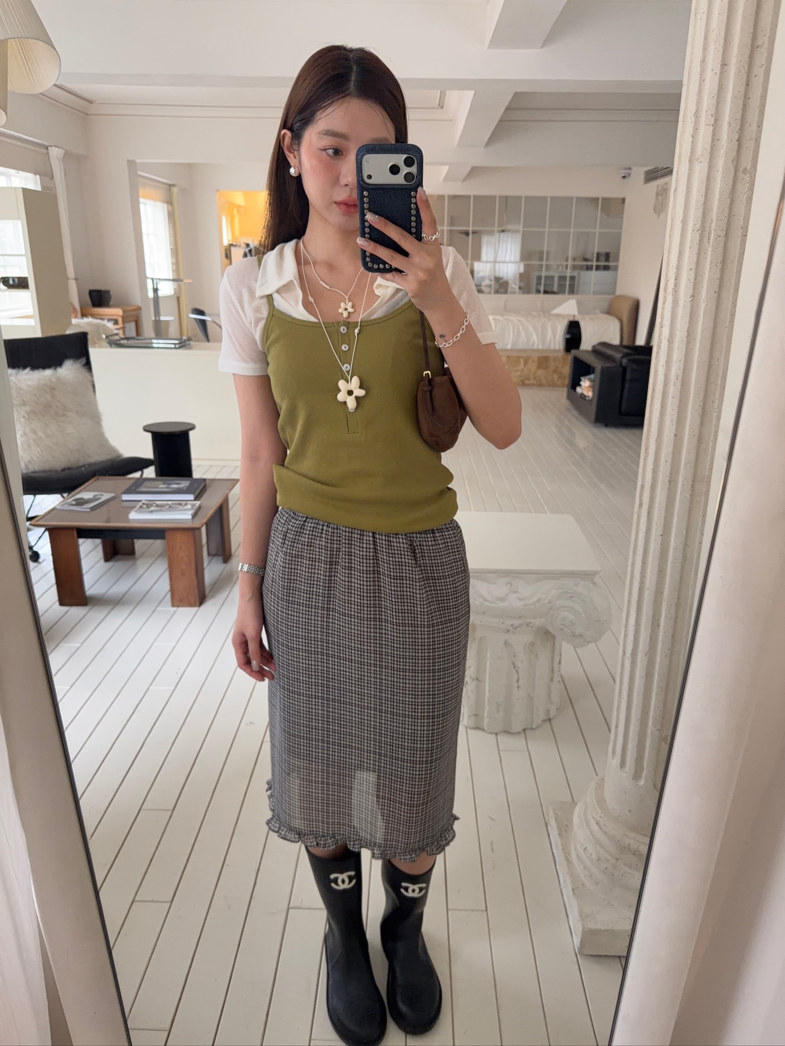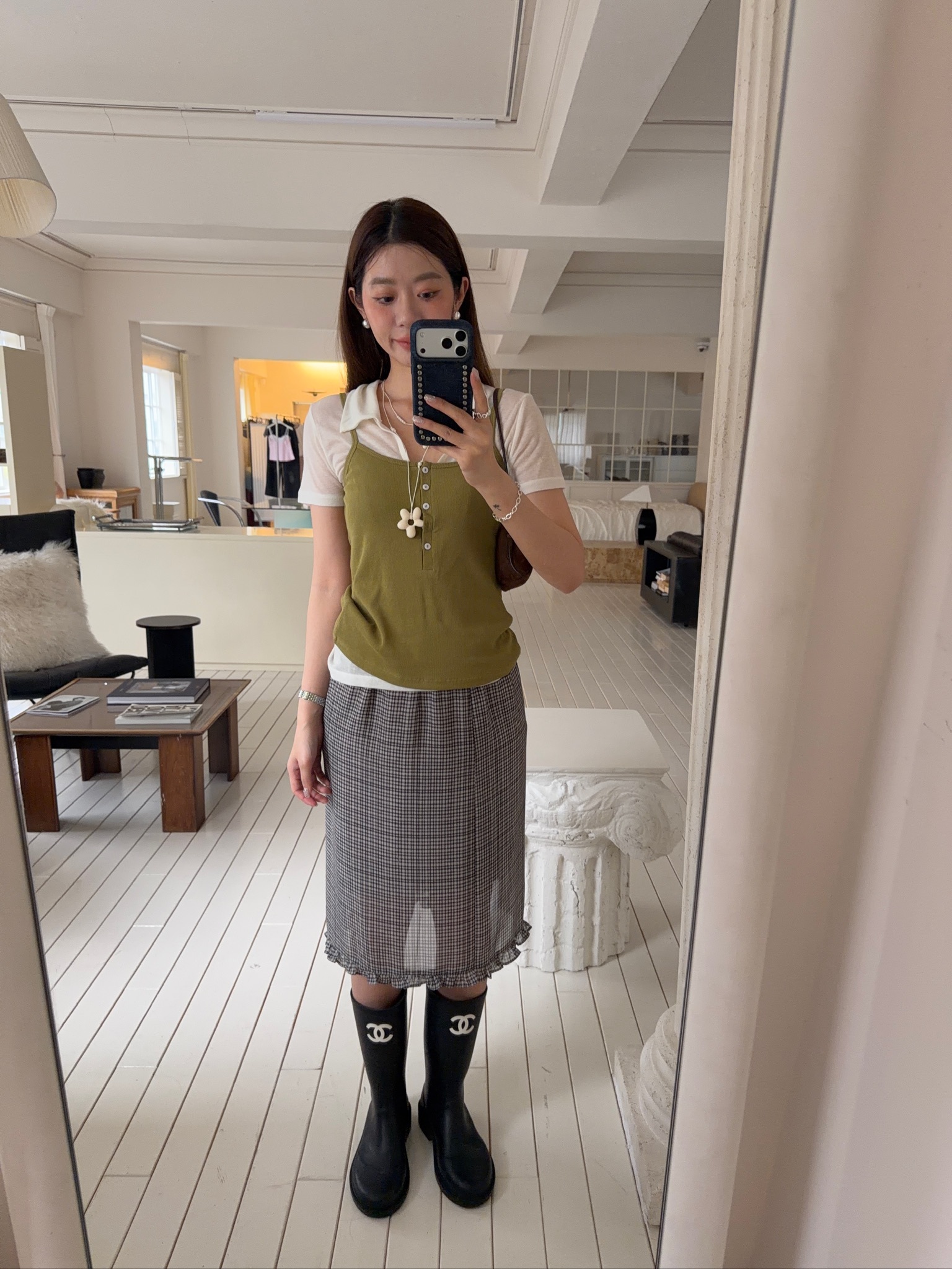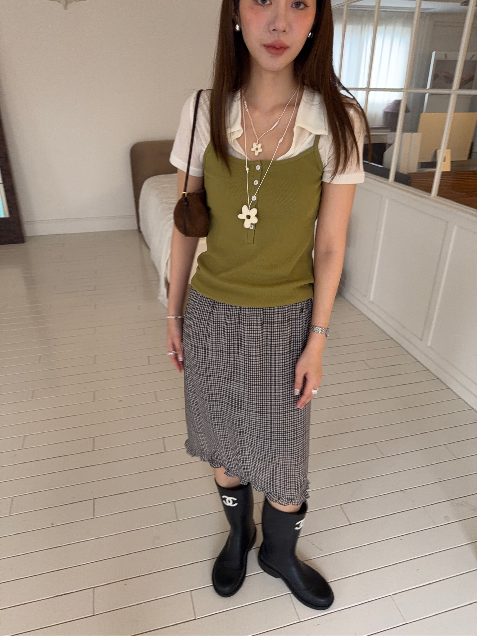 A48//格紋鬆緊腰中長裙