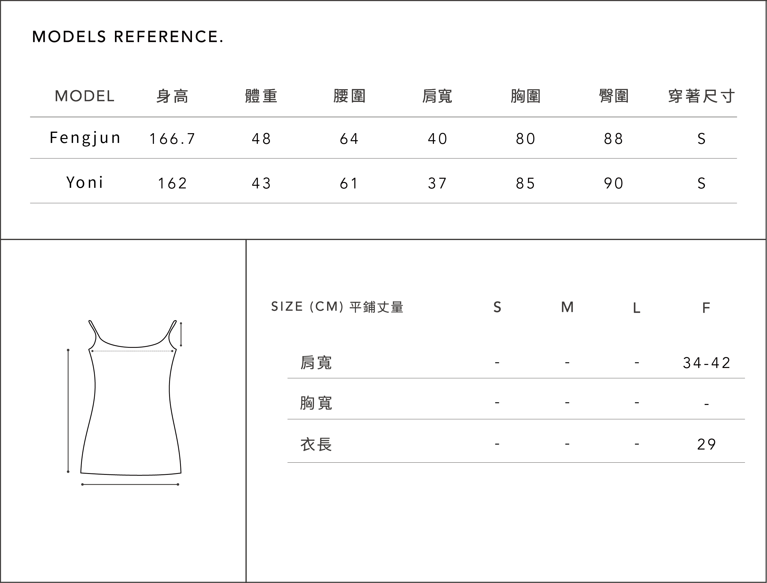 ※本尺寸表皆為水平丈量,會因布料彈性、測量起訖點等因素, 與實際商品尺寸略有誤差,誤差尺寸±3cm,