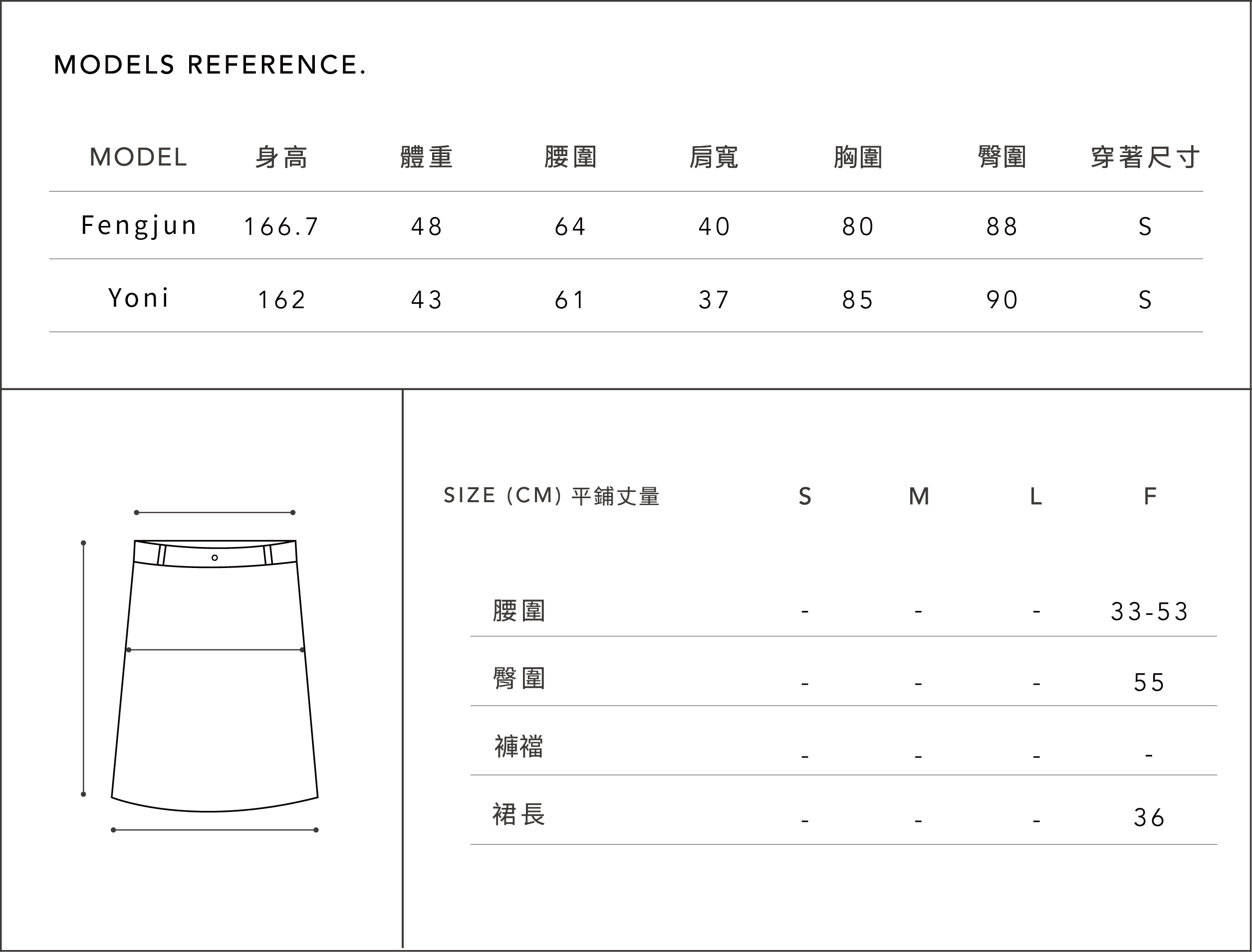 ※本尺寸表皆為水平丈量,會因布料彈性、測量起訖點等因素, 與實際商品尺寸略有誤差,誤差尺寸±3cm,